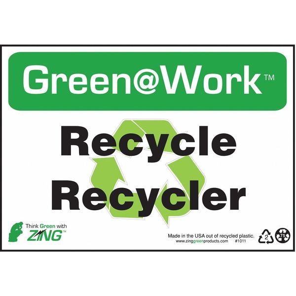 Recycling Sign, Sign Subject Matter Recycling, Height 7 In., Width 10 In., Sign Material Plastic, Sign Mounting Style Surface, Header Green@Work(TM), Legend Green@Work(TM) Recycle/Recycler, Printed Language English, Spanish, Sign Shape Rectangle