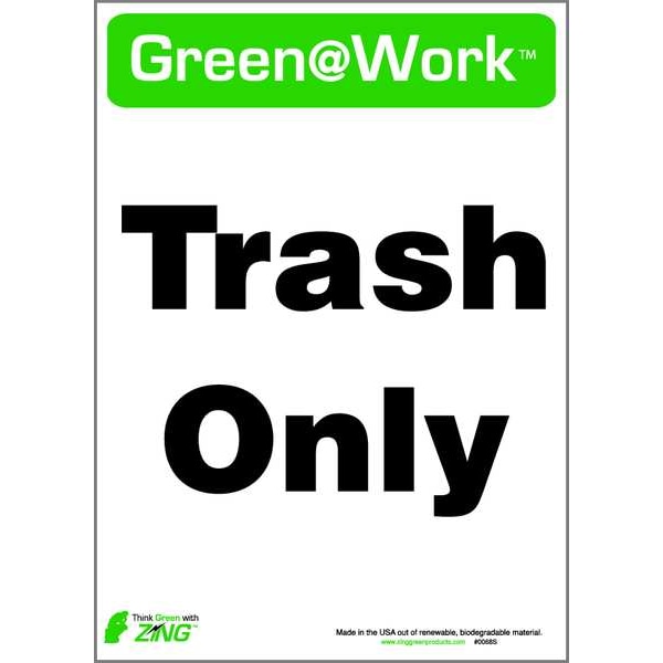 Waste Sign, Sign Subject Matter Cleaning and Maintenance, Height 14 In., Width 10 In., Sign Material Plastic, Sign Mounting Style Surface, Header Green@Work(TM), Legend Green@Work(TM) Trash Only, Printed Language English, Sign Shape Rectangle