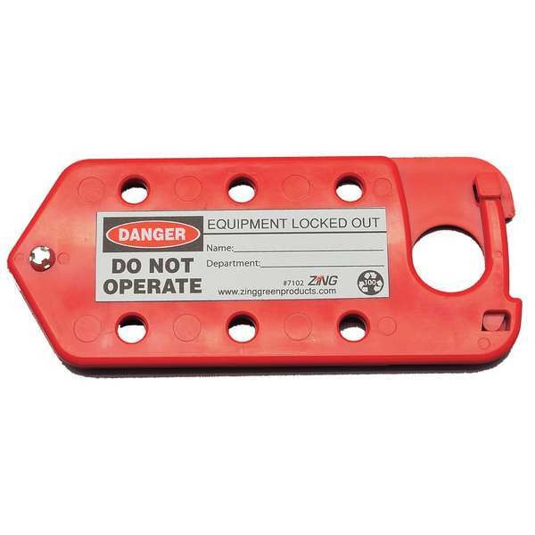 Labeled Lockout Hasp, Closed Jaw Hole Size 1 in, For Maximum Padlock Shackle Diameter 3/8 in, Hasp Closure Type Snap On, Lockout Material Plastic, Lockout Material Finish Not Applicable, Maximum Number of Padlocks 6, Product Type Labeled Hasp, Resistance Properties Pry Resistant, Hasp Style Standard, Header Danger, Legend Danger, Do Not Operate, Equipment Locked Out, Lockout Color Red, Overall Length 7 in, Overall Width 3 in