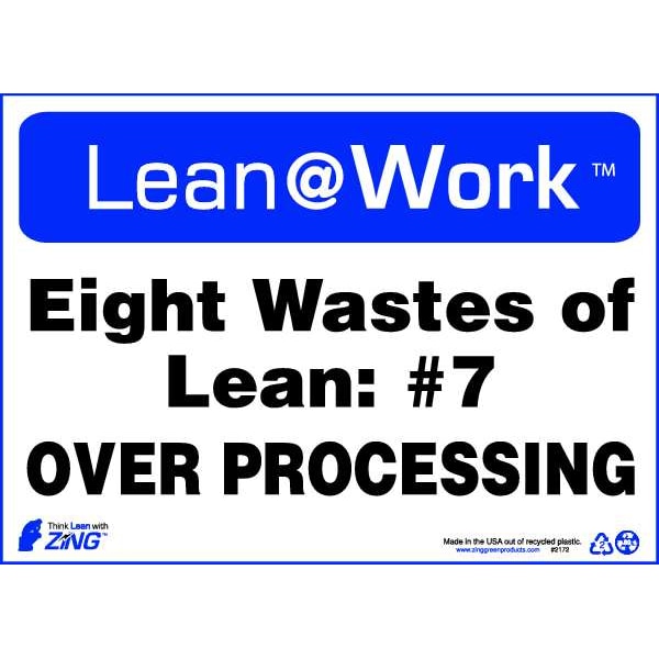 Lean Processes Sign, Sign Subject Matter Safety Incentive and Motivational, Height 10 In., Width 14 In., Sign Material Plastic, Sign Mounting Style Surface, Header Lean@Work, Legend Lean@Work(TM) Eight Wastes of Lean #7 Over Processing, Printed Language English, Sign Shape Rectangle