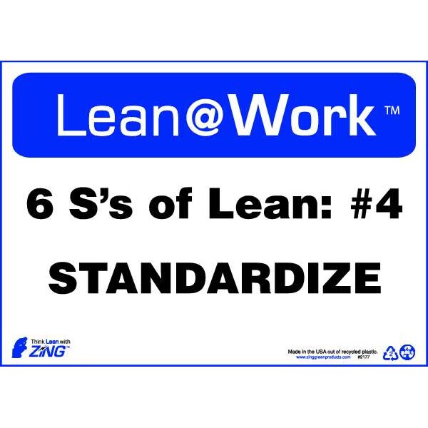 Lean Processes Sign, Sign Subject Matter Safety Incentive and Motivational, Height 10 In., Width 14 In., Sign Material Plastic, Sign Mounting Style Surface, Header Lean@Work, Legend Lean@Work(TM) 6 S's of Lean #4 Standardize, Printed Language English, Sign Shape Rectangle