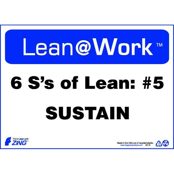 Lean Processes Sign, Sign Subject Matter Safety Incentive and Motivational, Height 10 In., Width 14 In., Sign Material Plastic, Sign Mounting Style Surface, Header Lean@Work, Legend Lean@Work(TM) 6 S's of Lean #5 Sustain, Printed Language English, Sign Shape Rectangle