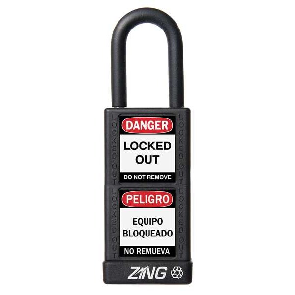 Lockout Padlock, Body Color Black, Body Height 3 in, Body Material Aluminum, Body Thickness 3/4 in, Body Width 1 1/2 in, Header Danger, Horizontal Shackle Clearance 3/4 in, Key Style Standard, Key Type Keyed Alike, Non-Removable Key Yes, Resistance Properties Corrosion Resistant, Shackle Diameter 1/4 in, Shackle Height 1 1/2 in, Shackle Material Steel, Shackle Type Open, Vertical Shackle Clearance 1 in, Width Across Shackle 11/16 in, Body Material Coating Plastic Encased, Body Shape Rectangular