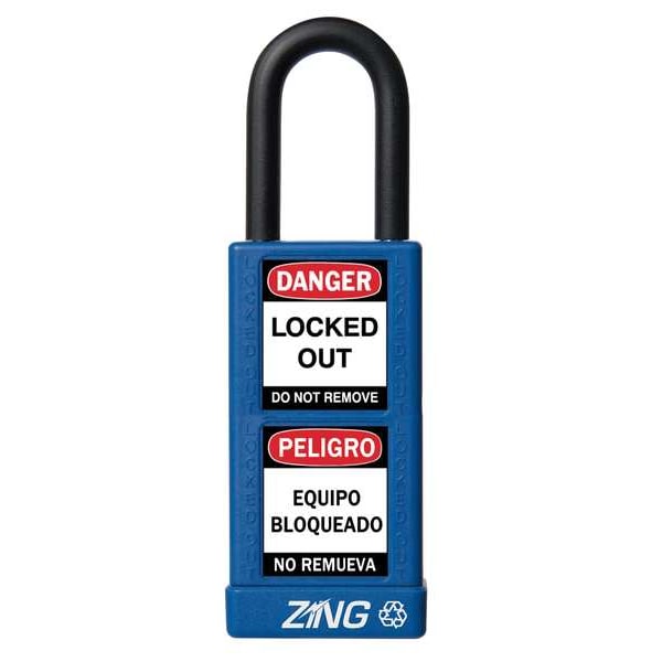 Lockout Padlock, Body Color Blue, Body Height 3 in, Body Material Aluminum, Body Thickness 3/4 in, Body Width 1 1/2 in, Header Danger, Horizontal Shackle Clearance 3/4 in, Key Style Standard, Key Type Keyed Alike, Non-Removable Key Yes, Resistance Properties Corrosion Resistant, Shackle Diameter 1/4 in, Shackle Height 1 1/2 in, Shackle Material Steel, Shackle Type Open, Vertical Shackle Clearance 1 in, Width Across Shackle 11/16 in, Body Material Coating Plastic Encased, Body Shape Rectangular