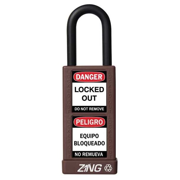 Lockout Padlock, Body Color Brown, Body Height 3 in, Body Material Aluminum, Body Thickness 3/4 in, Body Width 1 1/2 in, Header Danger, Horizontal Shackle Clearance 3/4 in, Key Style Standard, Key Type Keyed Alike, Non-Removable Key Yes, Resistance Properties Corrosion Resistant, Shackle Diameter 1/4 in, Shackle Height 1 1/2 in, Shackle Material Steel, Shackle Type Open, Vertical Shackle Clearance 1 in, Width Across Shackle 11/16 in, Body Material Coating Plastic Encased, Body Shape Rectangular