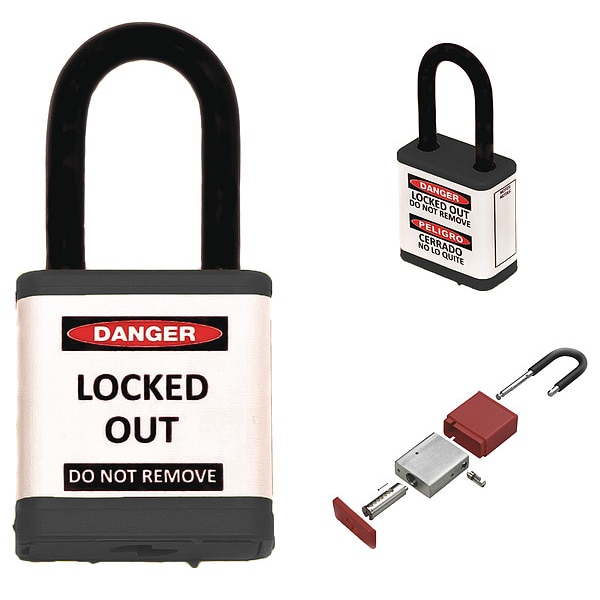 Lockout Padlock, Body Color Black, Body Height 3/4 in, Body Material Aluminum, Body Thickness 7/8 in, Body Width 1 1/2 in, Header Danger, Horizontal Shackle Clearance 3/4 in, Key Style Standard, Key Type Keyed Different, Non-Removable Key Yes, Resistance Properties Corrosion Resistant, Shackle Diameter 1/4 in, Shackle Height 1 1/2 in, Shackle Material Hardened Steel, Shackle Type Open, Vertical Shackle Clearance 1 in, Width Across Shackle 3/4 in, Body Material Coating Plastic Encased