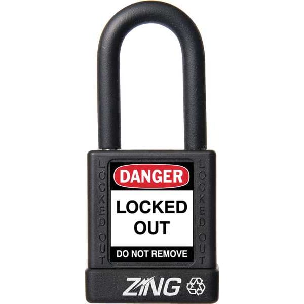 Lockout Padlock, Body Color Black, Body Height 1 3/4 in, Body Material Aluminum, Body Thickness 3/4 in, Body Width 1 1/2 in, Header Danger, Horizontal Shackle Clearance 3/4 in, Key Style Standard, Key Type Keyed Different, Non-Removable Key Yes, Resistance Properties Corrosion Resistant, Shackle Diameter 1/4 in, Shackle Height 1 1/2 in, Shackle Material Steel, Shackle Type Open, Vertical Shackle Clearance 1 in, Width Across Shackle 11/16 in, Body Material Coating Plastic Encased