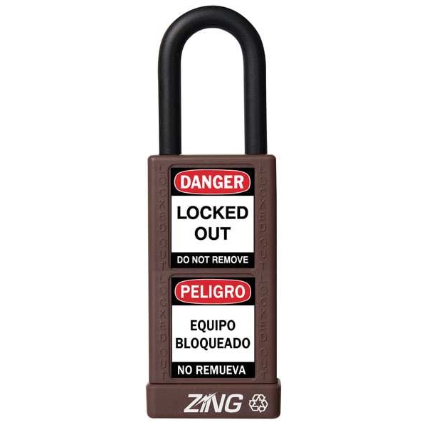 Lockout Padlock, Body Color Brown, Body Height 3 in, Body Material Aluminum, Body Thickness 3/4 in, Body Width 1 1/2 in, Header Danger, Horizontal Shackle Clearance 3/4 in, Key Style Standard, Key Type Keyed Different, Non-Removable Key Yes, Resistance Properties Corrosion Resistant, Shackle Diameter 1/4 in, Shackle Height 1 1/2 in, Shackle Material Steel, Shackle Type Open, Vertical Shackle Clearance 1 in, Width Across Shackle 11/16 in, Body Material Coating Plastic Encased