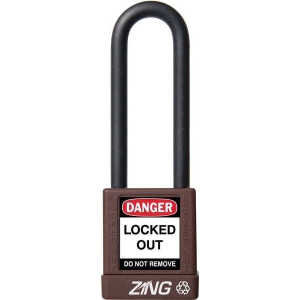 Lockout Padlock, Body Color Brown, Body Height 1 3/4 in, Body Material Aluminum, Body Thickness 3/4 in, Body Width 1 1/2 in, Header Danger, Horizontal Shackle Clearance 3/4 in, Key Style Standard, Key Type Keyed Different, Non-Removable Key Yes, Resistance Properties Corrosion Resistant, Shackle Diameter 1/4 in, Shackle Height 3 in, Shackle Material Steel, Shackle Type Extended, Vertical Shackle Clearance 3 in, Width Across Shackle 11/16 in, Body Material Coating Plastic Encased