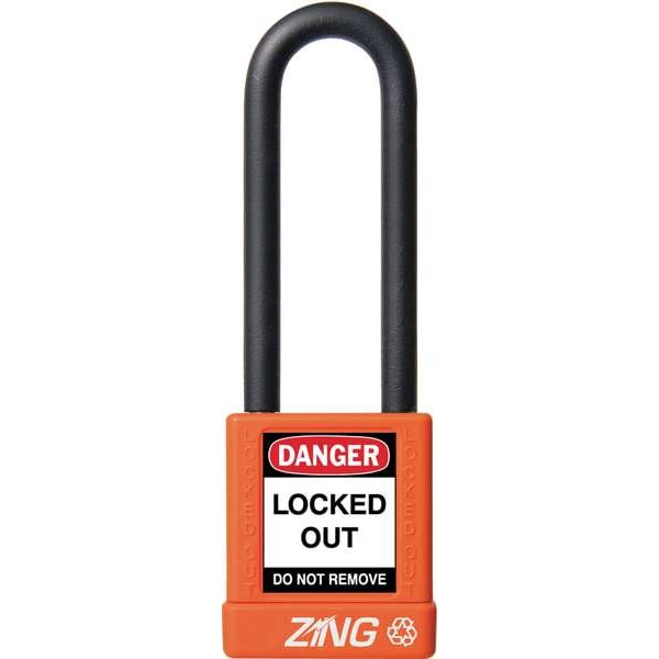 Lockout Padlock, Body Color Orange, Body Height 1 3/4 in, Body Material Aluminum, Body Thickness 3/4 in, Body Width 1 1/2 in, Header Danger, Horizontal Shackle Clearance 3/4 in, Key Style Standard, Key Type Keyed Different, Non-Removable Key Yes, Resistance Properties Corrosion Resistant, Shackle Diameter 1/4 in, Shackle Height 3 in, Shackle Material Steel, Shackle Type Extended, Vertical Shackle Clearance 3 in, Width Across Shackle 11/16 in, Body Material Coating Plastic Encased