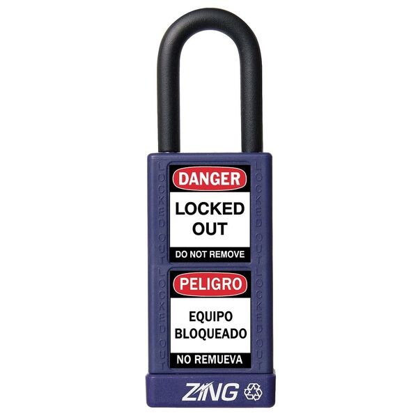Lockout Padlock, Body Color Purple, Body Height 3 in, Body Material Aluminum, Body Thickness 3/4 in, Body Width 1 1/2 in, Header Danger, Horizontal Shackle Clearance 3/4 in, Key Style Standard, Key Type Keyed Different, Non-Removable Key Yes, Resistance Properties Corrosion Resistant, Shackle Diameter 1/4 in, Shackle Height 1 1/2 in, Shackle Material Steel, Shackle Type Open, Vertical Shackle Clearance 1 in, Width Across Shackle 11/16 in, Body Material Coating Plastic Encased