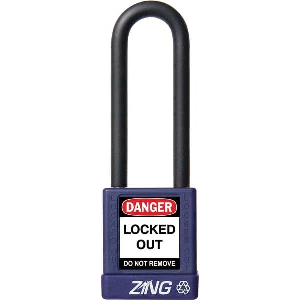 Lockout Padlock, Body Color Purple, Body Height 1 3/4 in, Body Material Aluminum, Body Thickness 3/4 in, Body Width 1 1/2 in, Header Danger, Horizontal Shackle Clearance 3/4 in, Key Style Standard, Key Type Keyed Different, Non-Removable Key Yes, Resistance Properties Corrosion Resistant, Shackle Diameter 1/4 in, Shackle Height 3 in, Shackle Material Steel, Shackle Type Extended, Vertical Shackle Clearance 3 in, Width Across Shackle 11/16 in, Body Material Coating Plastic Encased