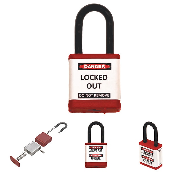 Lockout Padlock, Body Color Red, Body Height 3/4 in, Body Material Aluminum, Body Thickness 7/8 in, Body Width 1 1/2 in, Header Danger, Horizontal Shackle Clearance 3/4 in, Key Style Standard, Key Type Keyed Different, Non-Removable Key Yes, Resistance Properties Corrosion Resistant, Shackle Diameter 1/4 in, Shackle Height 1 1/2 in, Shackle Material Hardened Steel, Shackle Type Open, Vertical Shackle Clearance 1 in, Width Across Shackle 3/4 in, Body Material Coating Plastic Encased