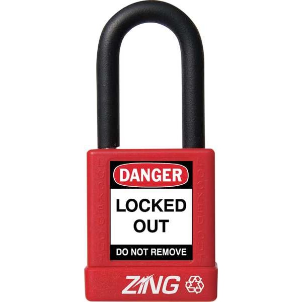 Lockout Padlock, Body Color Red, Body Height 1 3/4 in, Body Material Aluminum, Body Thickness 3/4 in, Body Width 1 1/2 in, Header Danger, Horizontal Shackle Clearance 3/4 in, Key Style Standard, Key Type Keyed Different, Non-Removable Key Yes, Resistance Properties Corrosion Resistant, Shackle Diameter 1/4 in, Shackle Height 1 1/2 in, Shackle Material Steel, Shackle Type Open, Vertical Shackle Clearance 1 in, Width Across Shackle 11/16 in, Body Material Coating Plastic Encased, Bumper Color Red