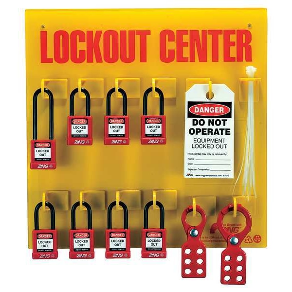 Lockout Station, Cable Lockouts Included Not Applicable, Cover Type Open Front, Filled Yes, Number of Hasps Included 2, Number of Lockouts Included 30, Number of Padlocks Included 8, Number of Tags Included 10, Visibility Inside Board Only, For Lockout Type General, Language English, Background Color Yellow