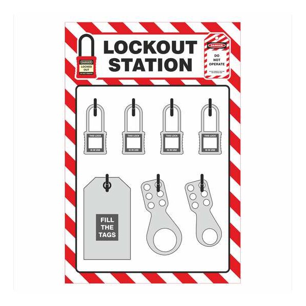 Lockout Tagout Station Shadow Board, Cable Lockouts Included Not Applicable, Cover Type Open Front, Electrical Lockouts Included Not Applicable, Filled No, Number of Hasps Included 0, Number of Lockouts Included 0, Number of Padlocks Included 0, Number of Tags Included 0, Visibility Inside Board Only, Language English, Spanish, Background Color Red/White, Includes Lockout Tagout Shadow Board, Legend Lockout Station, Legend Type Text, Material Aluminum, Mounting Location Wall, Number of Hooks 7