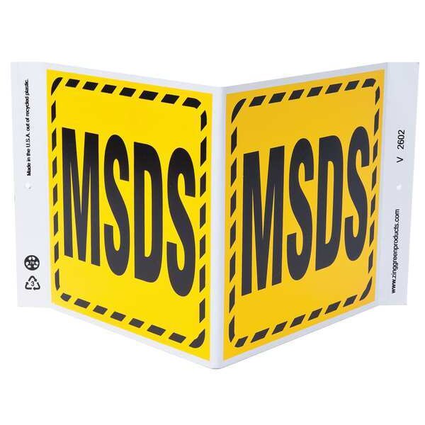 MSDS Sign, Sign Subject Matter SDS or Right to Know, Height 7 in, Width 12 in, Sign Material Plastic, Sign Mounting Style With Mounting Holes, V-Shaped, Legend MSDS, Printed Language English, Sign Shape V-Shaped