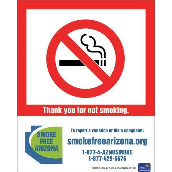 No Smoking Sign, Arizona, Sign Subject Matter No Smoking, Height 10 in, Width 7 in, Sign Material Plastic, Sign Mounting Style Surface, Legend Thank you for not smoking. To report a violation or file a compliant: smokefreearizona.org, 1-877-4-AZNOSMOKE, 1-877-429-6676, Smoke-Free Arizona Act ARS36-601.01, Printed Language English, Sign Shape Rectangle