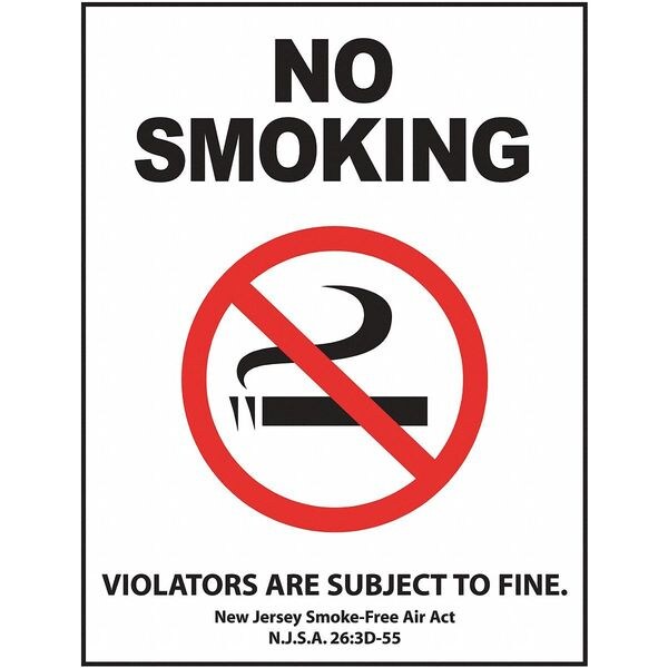 No Smoking Sign, New Jersey, Sign Subject Matter No Smoking, Height 14 in, Width 10 in, Sign Material Plastic, Sign Mounting Style Surface, Legend No Smoking, Violators Are Subject To Fine. New Jersey Smoke-Free Air Act, N.J.S.A. 26:3D-55, Printed Language English, Sign Shape Rectangle