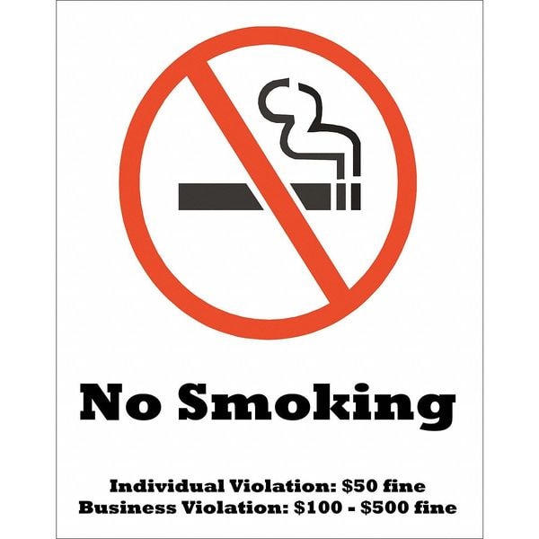 No Smoking Sign, Tennessee, Sign Subject Matter No Smoking, Height 10 in, Width 7 in, Sign Material Plastic, Sign Mounting Style Surface, Legend No Smoking, Individual Violation: 50 fine, Business Violation: 100 - 500 fine, Printed Language English, Sign Shape Rectangle
