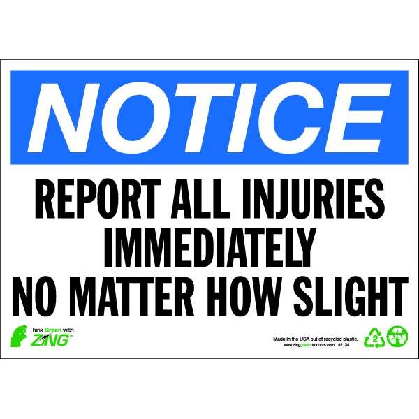 Notice Sign, Sign Subject Matter Accident Prevention, Height 10 In., Width 14 In., Sign Material Aluminum, Sign Mounting Style Surface, Header NOTICE, Legend Report All Injuries Immediately No Matter How Slight, Printed Language English, Sign Shape Rectangle
