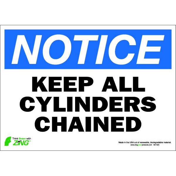Notice Sign, Sign Subject Matter Chemical, Gas or Hazardous Materials, Height 10 in, Width 14 in, Sign Material Polyester, Sign Mounting Style Adhesive Surface, Header Notice, Legend Keep All Cylinders Chained, Printed Language English, Sign Shape Rectangle