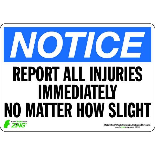 Notice Sign, Sign Subject Matter Accident Prevention, Height 7 In., Width 10 In., Sign Material Polyester, Sign Mounting Style Adhesive Surface, Header NOTICE, Legend Report All Injuries Immediately No Matter How Slight, Printed Language English, Sign Shape Rectangle