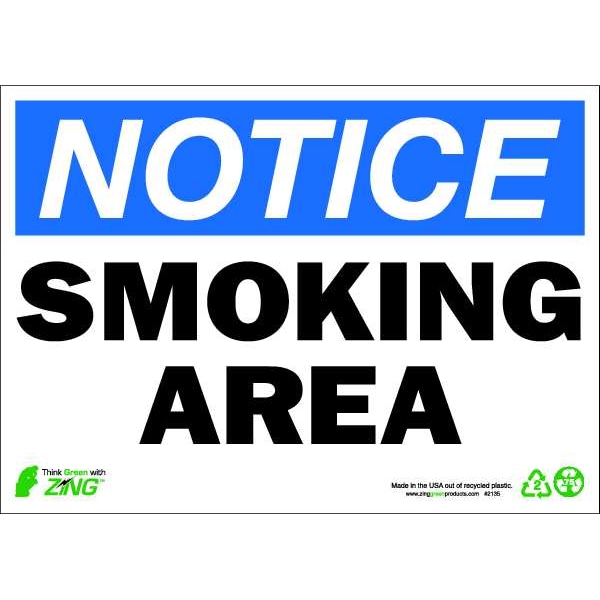 Notice Smoking Sign, Sign Subject Matter No Smoking, Height 10 in, Width 14 in, Sign Material Plastic, Sign Mounting Style Surface, Header NOTICE, Legend Smoking Area, Printed Language English, Sign Shape Rectangle