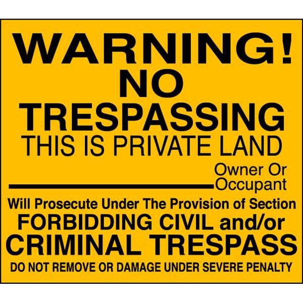 Warning No Trespassing This Is Private Land Owner Or Occupant Will Prosecute Under The Provision Of Section Forbidding Civil And/Or Criminal Trespass Do Not Remove Or Damage Under Severe Penalty