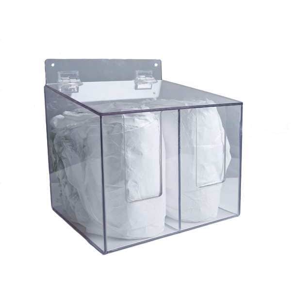 Protection Dispenser, Color Clear, Dispensing Method Hinged Top, Includes Pre-drilled Holes for Mounting, Material Recycled Plastic, Mounting Location Wall, Overall Depth 10 1/2 in, Overall Height 12 in, Overall Width 11 1/2 in, Standards UL Listed