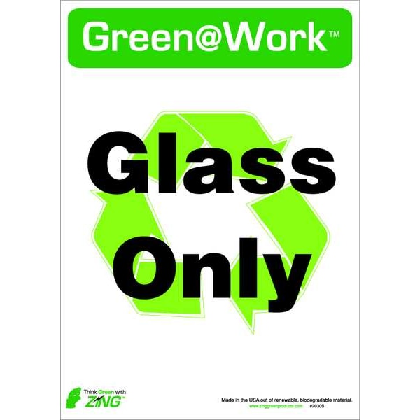 Recycle Label, Sign Subject Matter Recycling, Height 14 In., Width 10 In., Sign Material Plastic, Sign Mounting Style Adhesive Surface, Header Green@Work, Legend Green@Work(TM) Glass Only (Recycle Symbol), Printed Language English, Sign Shape Rectangle, Package Quantity 5
