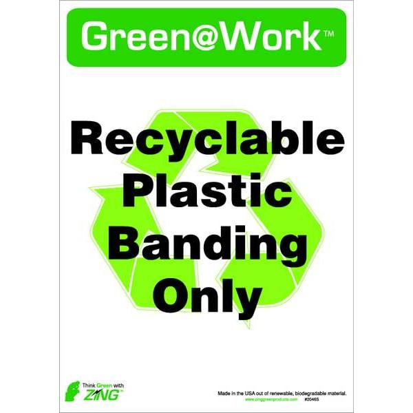 Recycle Label, Sign Subject Matter Recycling, Height 14 In., Width 10 In., Sign Material Plastic, Sign Mounting Style Adhesive Surface, Header Green@Work, Legend Green@Work(TM) Recyclable Plastic Banding Only (Recycle Symbol), Printed Language English, Sign Shape Rectangle, Package Quantity 5