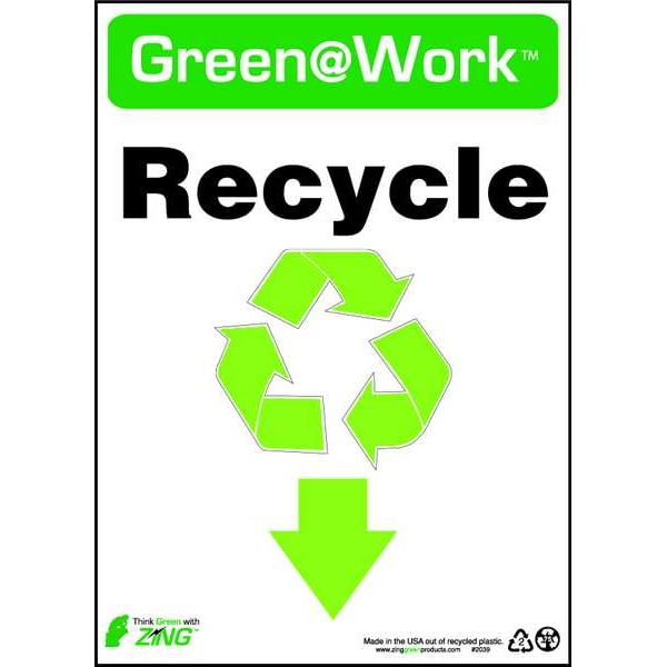 Recycling Sign, Sign Subject Matter Recycling, Height 14 In., Width 10 In., Sign Material Plastic, Sign Mounting Style Surface, Header Green@Work, Legend Green@Work(TM) Recycle, Printed Language English, Sign Shape Rectangle