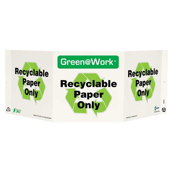 Recycling Sign, Sign Subject Matter Recycling, Height 7-1/2 In., Width 20 In., Sign Material Plastic, Sign Mounting Style With Mounting Holes, V-Shaped, Header Green@Work, Legend Green@Work(TM) Recyclable Paper Only, Printed Language English, Sign Shape Rectangle