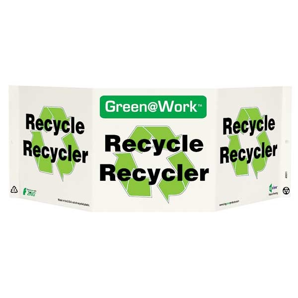 Recycling Sign, Sign Subject Matter Recycling, Height 7-1/2 In., Width 20 In., Sign Material Plastic, Sign Mounting Style With Mounting Holes, V-Shaped, Header Green@Work, Legend Green@Work(TM) Recycle/Recycler, Printed Language English, Spanish, Sign Shape Rectangle
