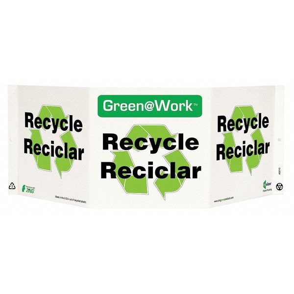 Recycling Sign, Sign Subject Matter Recycling, Height 7-1/2 In., Width 20 In., Sign Material Plastic, Sign Mounting Style With Mounting Holes, V-Shaped, Header Green@Work, Legend Green@Work(TM) Recycle/Reciclar, Printed Language English, Spanish, Sign Shape Rectangle