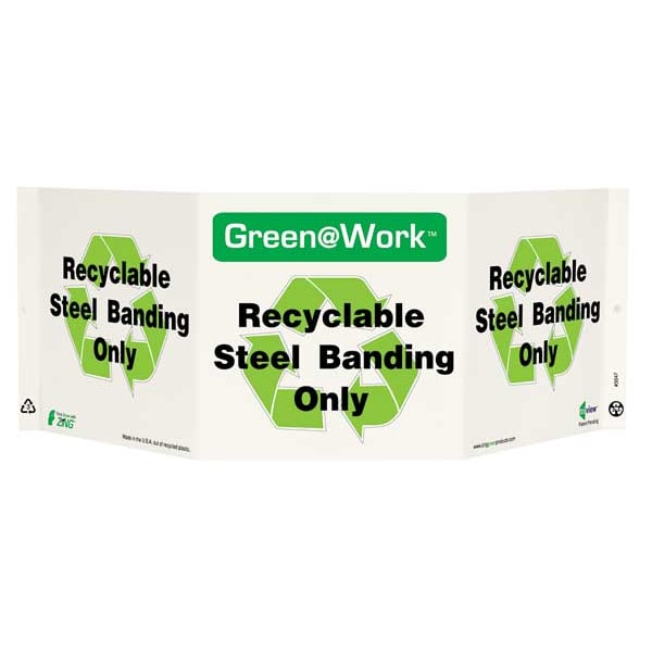 Recycling Sign, Sign Subject Matter Recycling, Height 7-1/2 In., Width 20 In., Sign Material Plastic, Sign Mounting Style With Mounting Holes, V-Shaped, Header Green@Work, Legend Green@Work(TM) Recyclable Steel Banding Only, Printed Language English, Sign Shape Rectangle