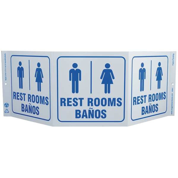 Restroom Sign, Sign Subject Matter Restrooms, Sign Material Plastic, Sign Mounting Style 3-Sided, With Mounting Holes, Legend Restrooms/Banos, Printed Language English, Spanish
