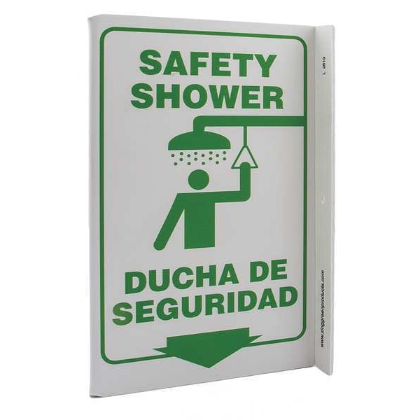 Safety Shower Sign, Sign Subject Matter Eyewash and Shower, Height 11 In., Width 8 In., Sign Material Plastic, Sign Mounting Style With Mounting Holes, L-Shaped, Legend Safety Shower/Ducha De Seguridad, Printed Language English, Spanish, Sign Shape L-Shaped