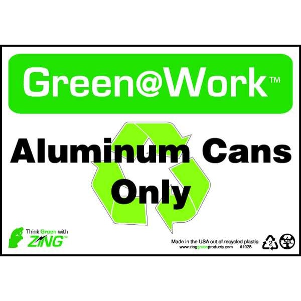 Recycling Sign, Sign Subject Matter Recycling, Height 7 In., Width 10 In., Sign Material Plastic, Sign Mounting Style Surface, Header Green@Work, Legend Green@Work(TM) Aluminum Cans Only, Printed Language English, Sign Shape Rectangle