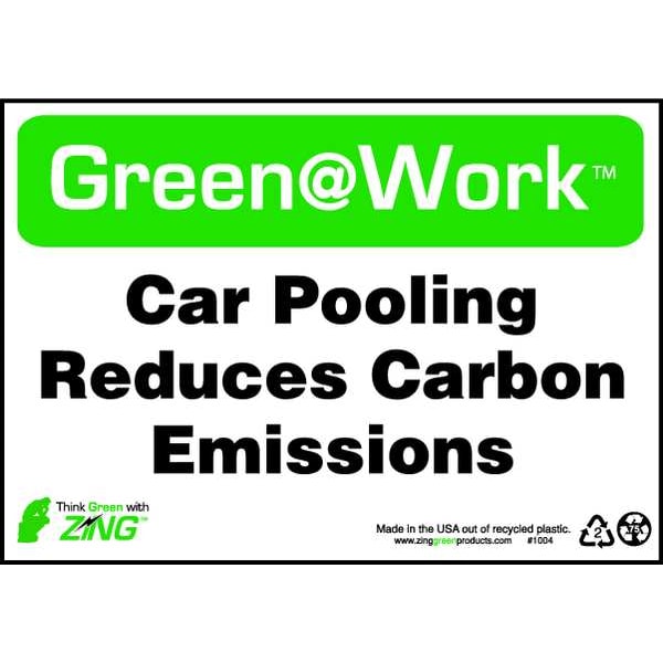 Conservation Sign, Sign Subject Matter Facility, Height 7 In., Width 10 In., Sign Material Plastic, Sign Mounting Style Surface, Header Green@Work(TM), Legend Green@Work(TM) Car Pooling Reduces Carbon Emissions, Printed Language English, Sign Shape Rectangle