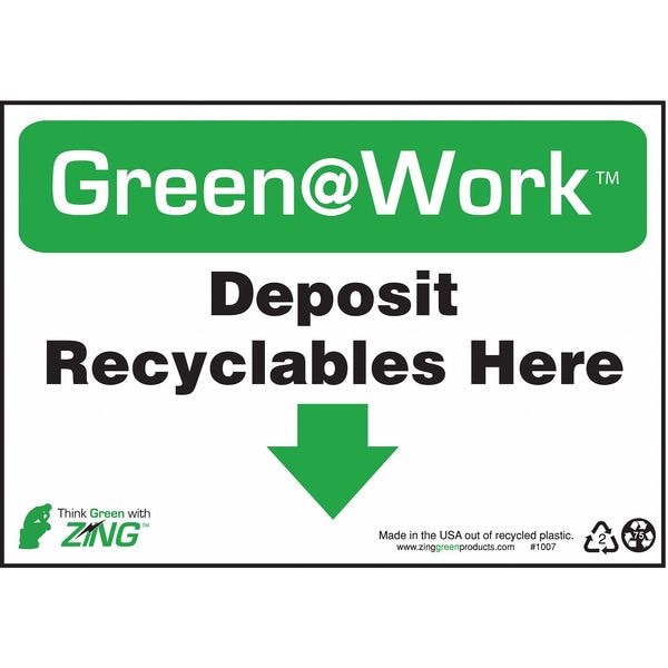 Recycling Sign, Sign Subject Matter Recycling, Height 7 In., Width 10 In., Sign Material Plastic, Sign Mounting Style With Mounting Holes, Header Green@Work(TM), Legend Green@Work(TM) Deposit Recyclables Here Down Arrow, Printed Language English, Sign Shape Rectangle