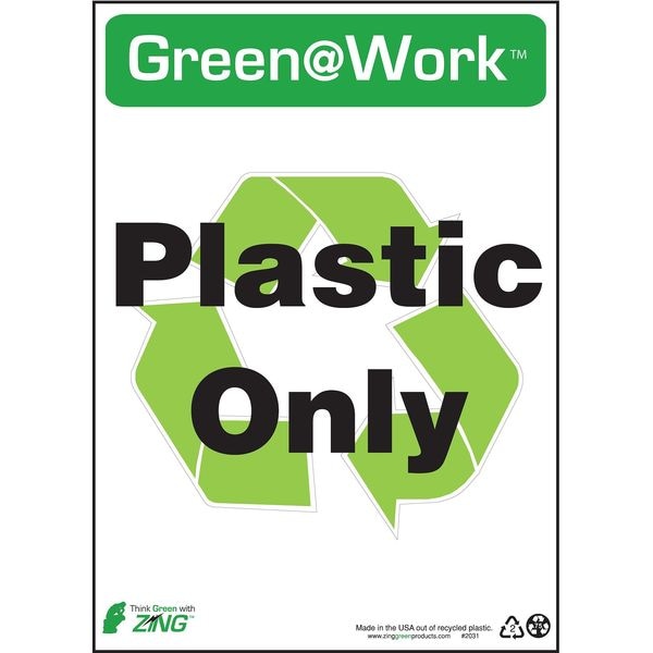 Recycling Sign, Sign Subject Matter Recycling, Height 14 In., Width 10 In., Sign Material Plastic, Sign Mounting Style Surface, Header Green@Work, Legend Green@Work(TM) Plastic Only, Printed Language English, Sign Shape Rectangle