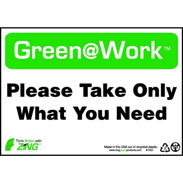 Recycling Sign, Sign Subject Matter Recycling, Height 7 In., Width 10 In., Sign Material Plastic, Sign Mounting Style Surface, Header Green@Work, Legend Green@Work(TM) Please Take Only What You Need, Printed Language English, Sign Shape Rectangle