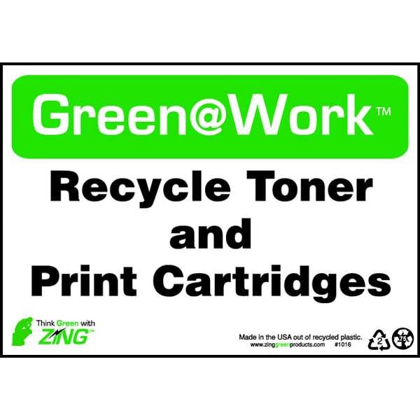 Recycling Sign, Sign Subject Matter Recycling, Height 7 In., Width 10 In., Sign Material Plastic, Sign Mounting Style Surface, Header Green@Work, Legend Green@Work(TM) Recycle Toner and Print Cartridges, Printed Language English, Sign Shape Rectangle