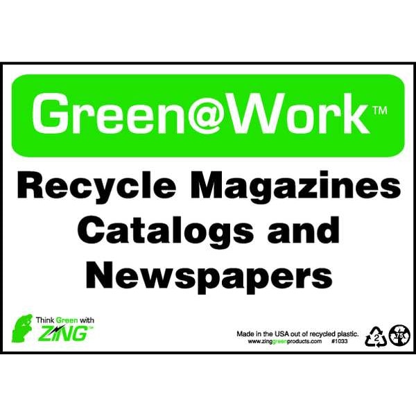 Recycling Sign, Sign Subject Matter Recycling, Height 7 In., Width 10 In., Sign Material Plastic, Sign Mounting Style Surface, Header Green@Work, Legend Green@Work(TM) Recycle Magazines Catalogs and Newspapers, Printed Language English, Sign Shape Rectangle