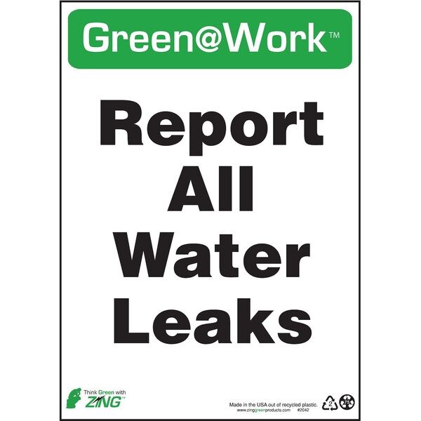 Conservation Sign, Sign Subject Matter Recycling, Height 14 In., Width 10 In., Sign Material Plastic, Sign Mounting Style Surface, Header Green@Work, Legend Green@Work(TM) Report All Water Leaks, Printed Language English, Sign Shape Rectangle