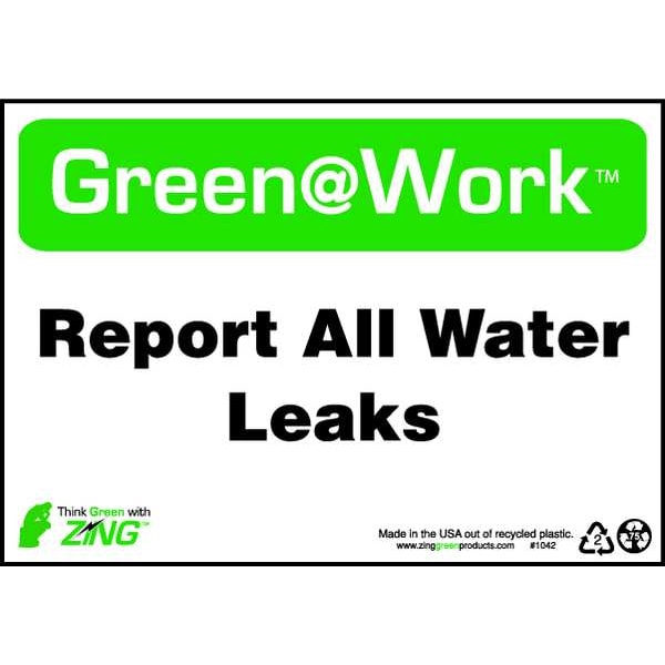 Conservation Sign, Sign Subject Matter Recycling, Height 7 In., Width 10 In., Sign Material Plastic, Sign Mounting Style Surface, Header Green@Work, Legend Green@Work(TM) Report All Water Leaks, Printed Language English, Sign Shape Rectangle