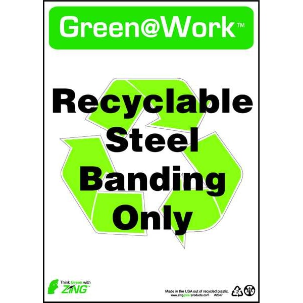 Recycling Sign, Sign Subject Matter Recycling, Height 14 In., Width 10 In., Sign Material Plastic, Sign Mounting Style Surface, Header Green@Work, Legend Green@Work(TM) Recyclable Steel Banding Only, Printed Language English, Sign Shape Rectangle