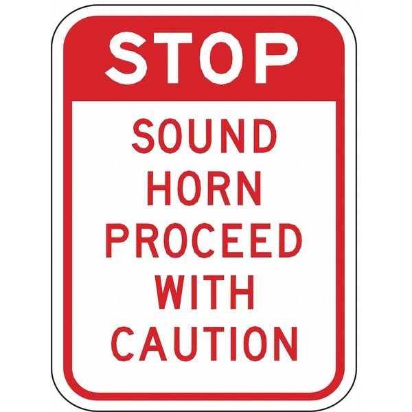 Traffic Sign, Sign Subject Matter Lift Truck Traffic, Height 18 In., Width 12 In., Sign Material Aluminum, Legend Stop Sound Horn Proceed With Caution, Printed Language English, Sign Shape Rectangle